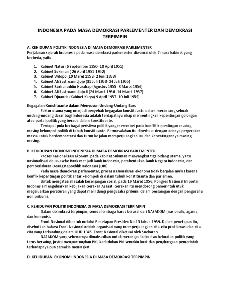 259-261 mengenai kehidupan masyarakat Indonesia pada masa demokrasi terpimpin dari aspek sosial pendidikan dan. Periode demokrasi parlementer di Indonesia dimulai dari 17 Agustus 1950 sampai 5 Juli 1959. Gejolak politik menyebabkan munculnya gangguan kemanan di berbagai tempat dan upaya perbaikan ekonomi yang tidak berjalan lancar.
